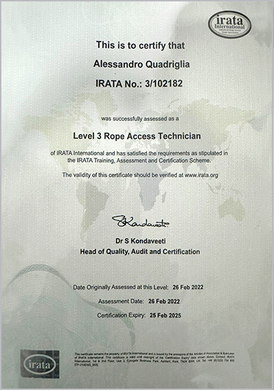 Le competenze tecniche sono derivate da una pratica esercitata in modo continuativo da 20 anni, nonché di corsi mirati alla formazione per il lavoro in quota su corda secondo il D.lgs 81 del 2008.