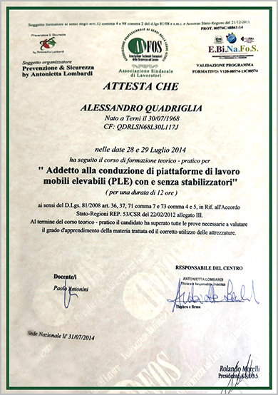 Dal 2014 in base alle competenze, alle ore di docenza di formazione e dopo aver conseguito l'attestato presso un centro AiFOS da Formatore per la Sicurezza offriamo anche servizi di consulenza per la sicurezza su lavoro e formazione (addestramento) lavori su fune e lavori in quota.